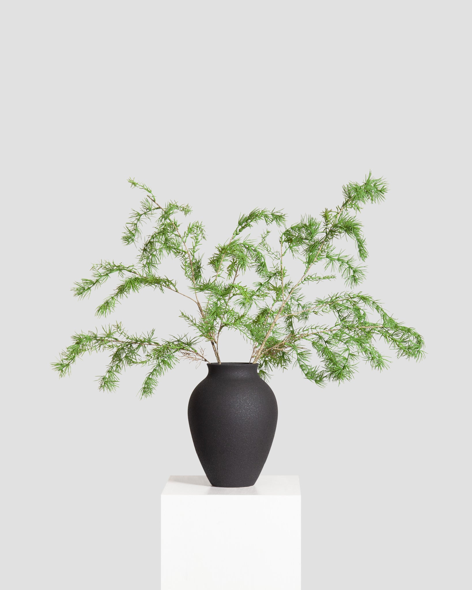 A monochrome bouquet composed of artificial cryptomeria japonica branches in green that create a light seasonal presence.