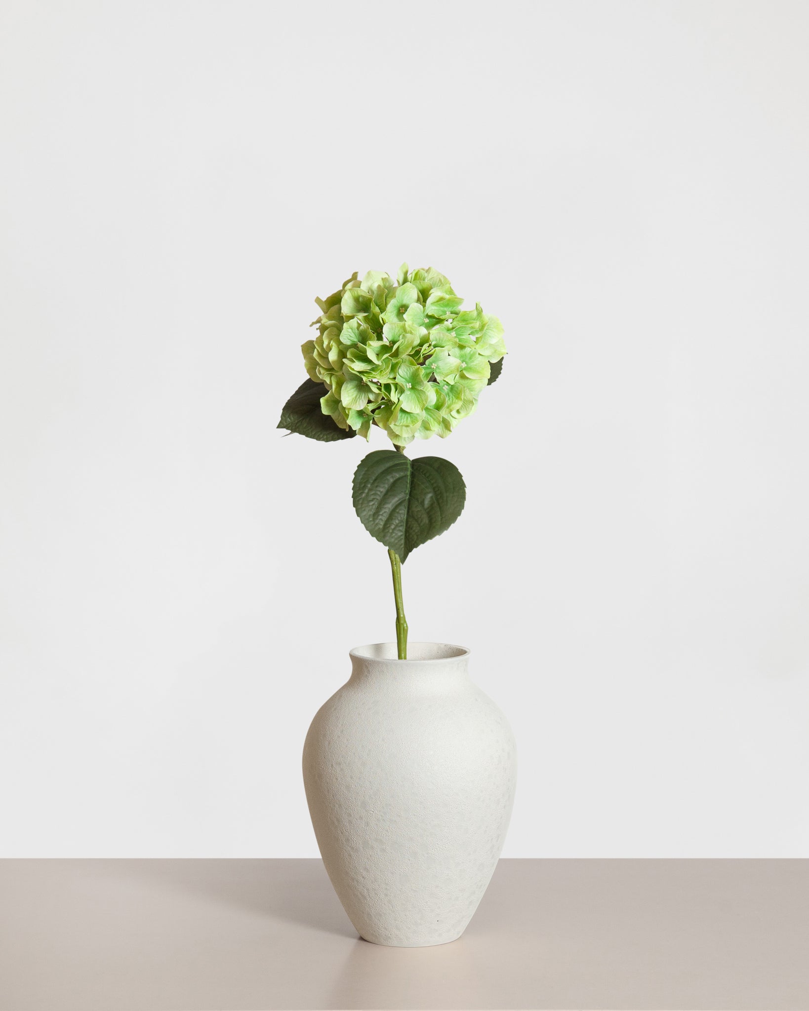An artificial hydrangea in fresh green tones. The clustered petals have a natural shape and soft texture that closely resemble a fresh stem. Styled standalone or combined in a bouquet, it adds volume and structure to any interior. Real touch.