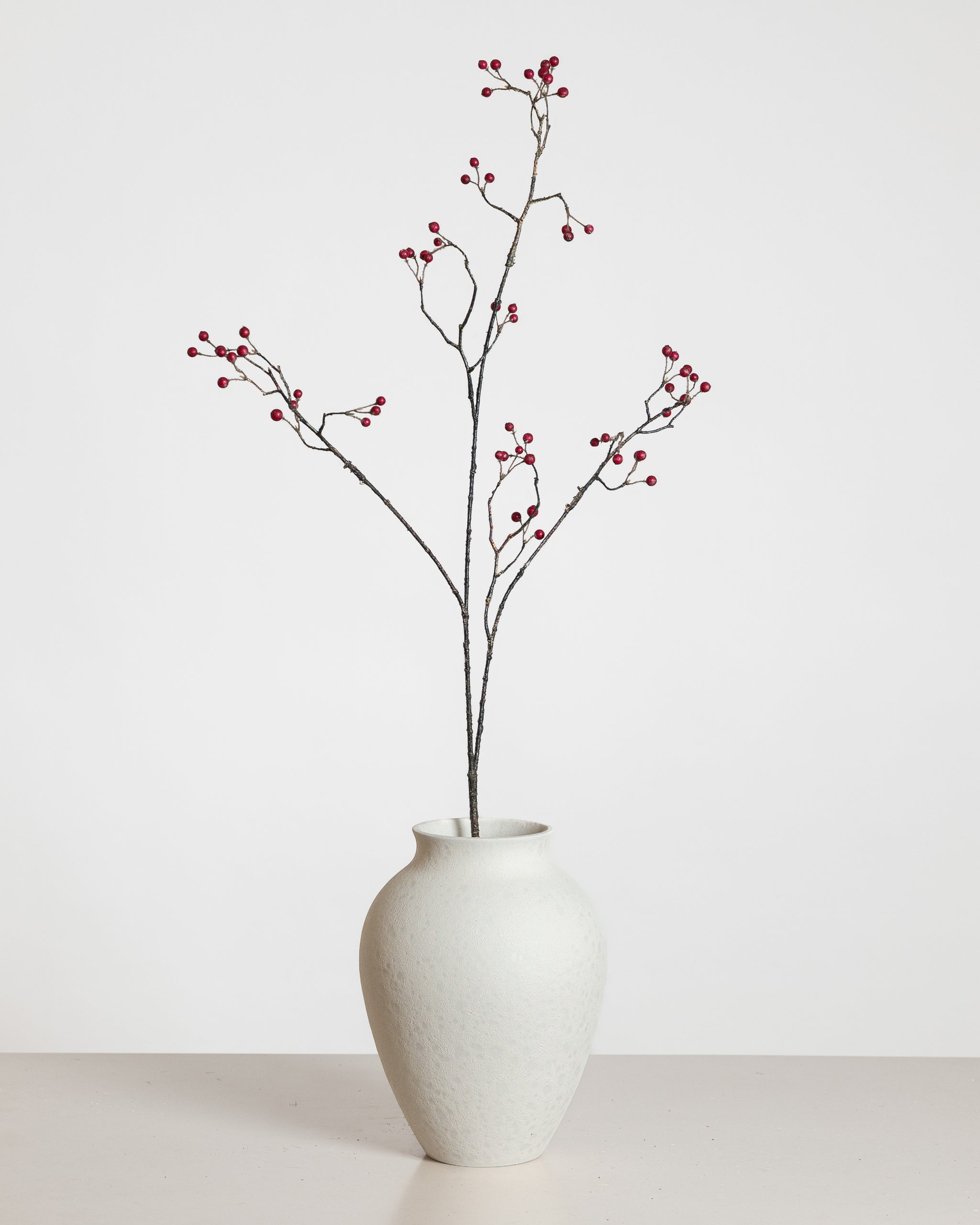 En konstgjord bärgren med klasade bär i mörkröda toner. Den öppna grenningen skapar en ljus, naturlig silhuett med subtil säsongskaraktär.